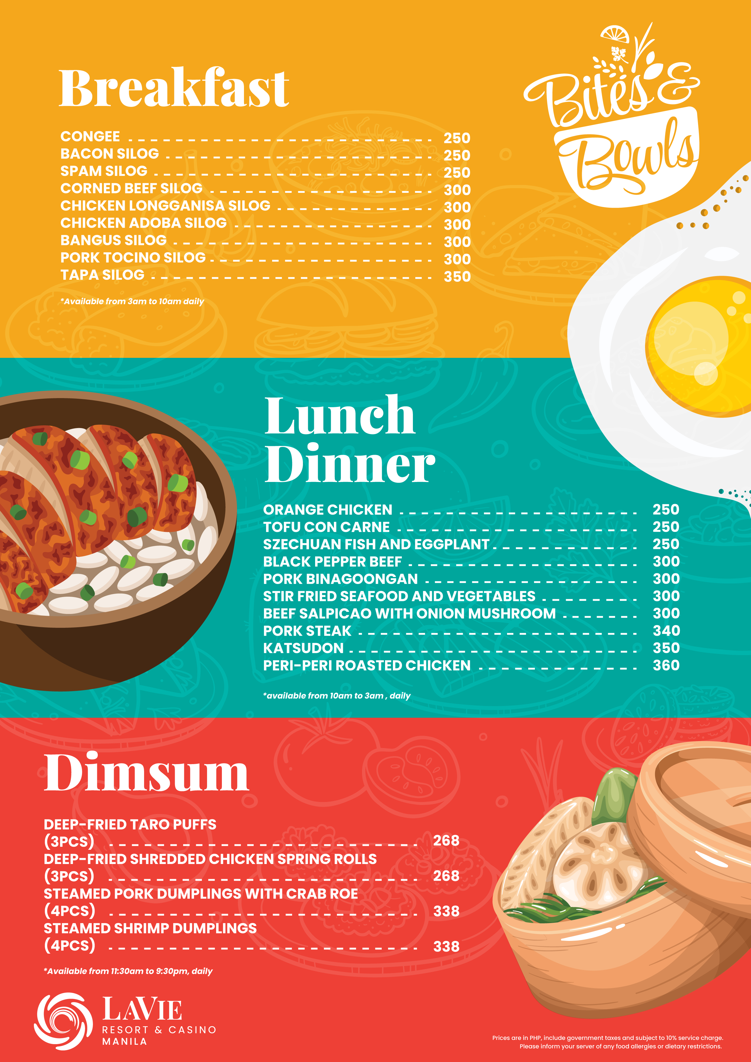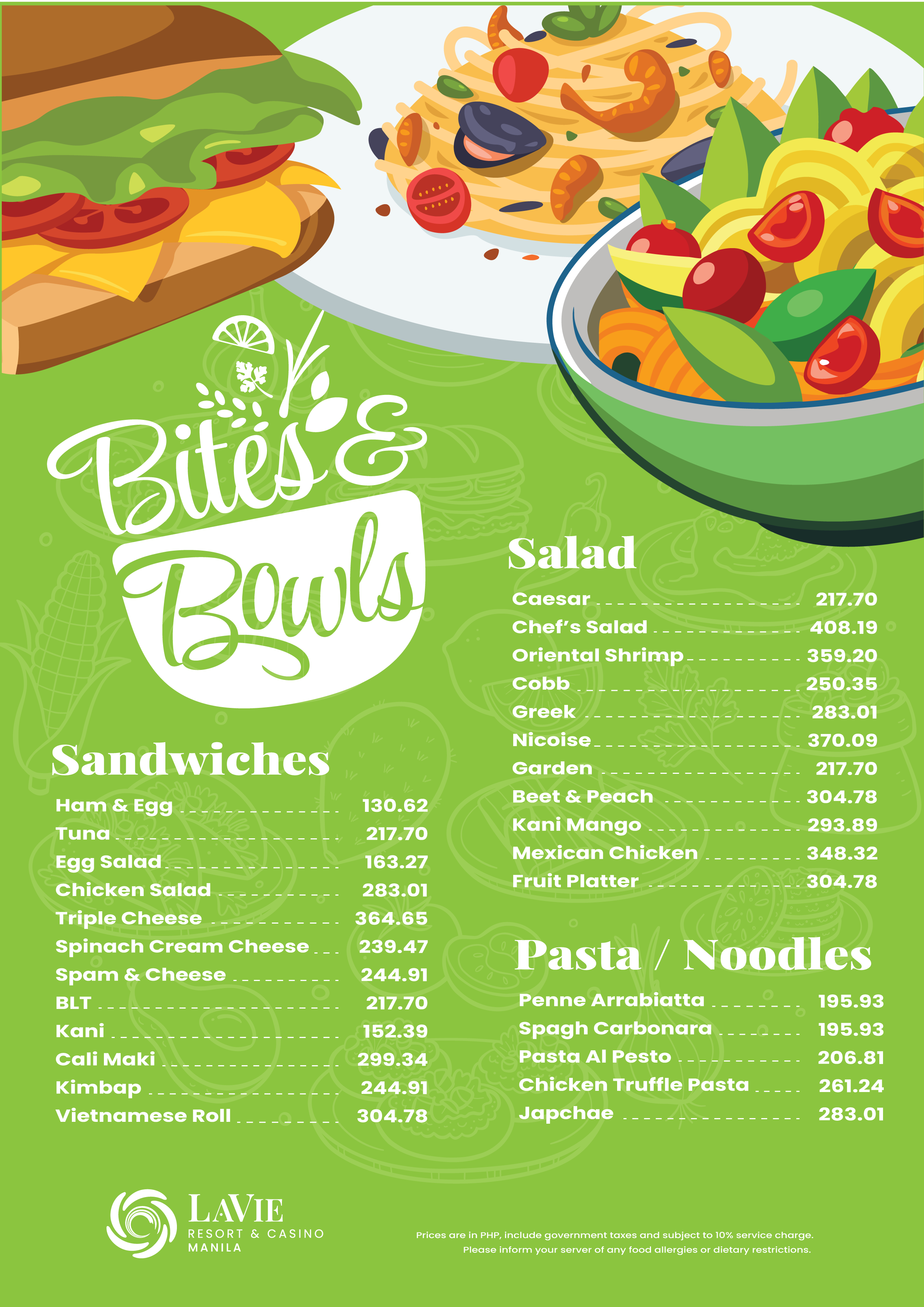 Located on the 3rd floor, Bites & Bowls offers a diverse menu, including rice toppings, sandwiches, salads, dim sum, roll-ups, pasta, and noodles. Enjoy a quick bites or hearty meals in a casual, comfortable setting.